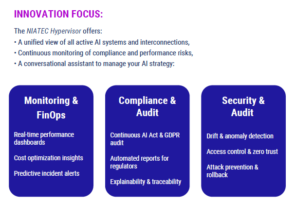 - The NIATEC AI Hypervisor, a groundbreaking platform for real-time supervision, compliance monitoring, and cost optimization across all AI deployments.